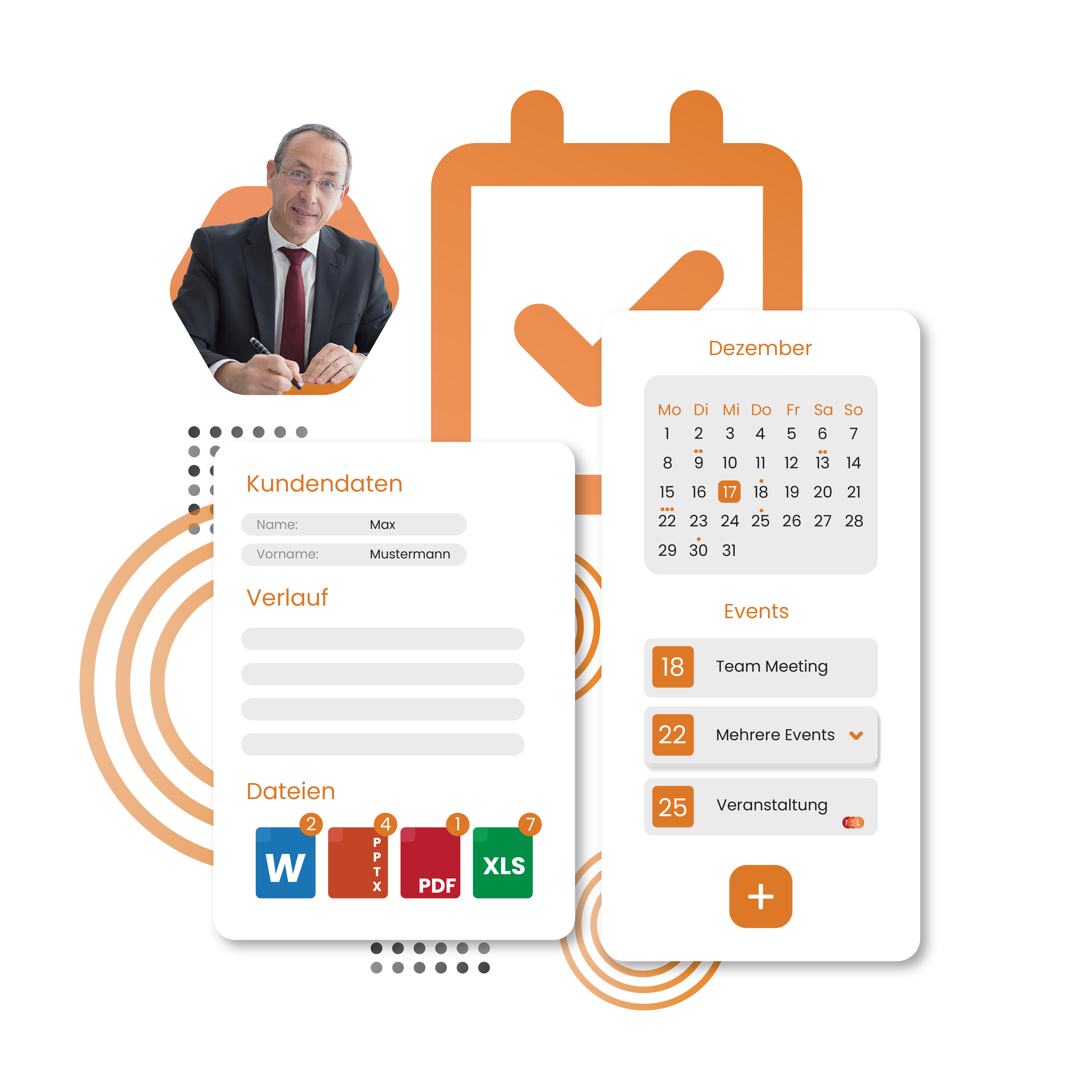 Die effiziente Eventplanung und das integrierte CRM helfen Ihnen, mit maximaler Leichtigkeit bei der Pflege von Neu- und Bestandsmandaten. So haben Sie für jedes Mandat vom ersten Kontakt an eine Historie.